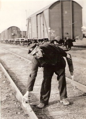 Posunovač v rovnošate kladúci zarážku. Za ním vozne Ztr a plošinové. Text: Bratislava Východ, zriaďovacia stanica. Anon., cca 1950. 163 x 120