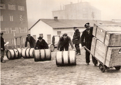 Skupina mužov v železn. rovnošatách pri pri gúľaní sudov a prevoze drev. debien na rudle na nákladišti Bratislava hl. st. Text: Žst. Bratislava hlavná st., hlavný sklad, výdaj a podaj. Anon., cca 1950. 156 x 115
