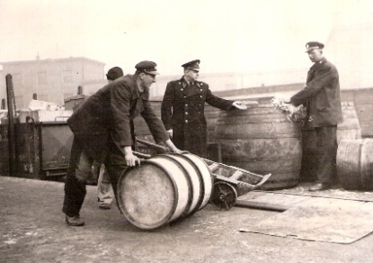Štyria muži v železn. rovnošatách (jeden úradník) pri nakládke nízkosten. vozňa sudami. Drevená rudla. Text: Bratislava hlavná st., hlavný sklad, výdaj a podaj. Anon., cca 1950. 155 x 113