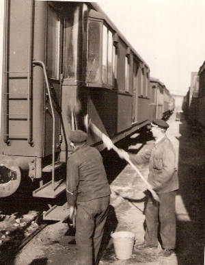Dvaja muži v pracovnom, jeden so železn. čiapkou pri ručnom čistení skrine vozňa D typu Rybák (ešte schodíky na strechu). Anon., cca 1960. 84 x 110