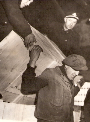 Traja muži, jeden z nich v pracovnom, ost. v rovnošate pri prenášaní dreven. debny v interiéri skladu. Text: Žst. Bratislava hl. st. Anon., cca 1960. 110 x 148