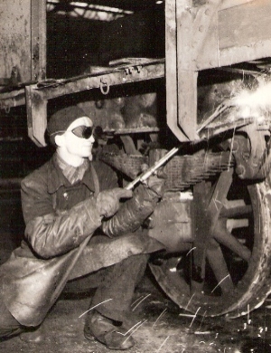 Palič v rovnošate a baretke so zváračskými ochr. pomôc. pri pálení na ráme dvojnápr. vozňa na uhlie so špic. liatymi kolesami a kovan. rázsochami. Text: Dielne Trnava ČSD n.p., oprava vagónov na páse. Anon., cca 1955. 84 x 110