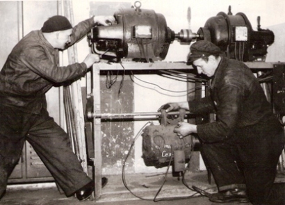 Dvaja muži v prac. pri skúšaní vozňového dynama sústrojenstvom Ward-Leonard. Text: Elektrotechnická správa Bratislava, čatár s. Ján Ando, s. pavel Majcík. Anon., cca 1955. 170 x 122