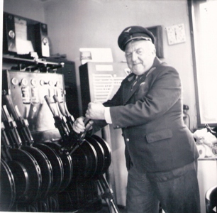 Výhybkár pri obsluhe výhybk. elektromech. prístroja. Text: Bratislava - filiálka, stavadlo I., pán Križan - signalista, pri práci. Foto: M. Entner, leto 1988. 127 x 125