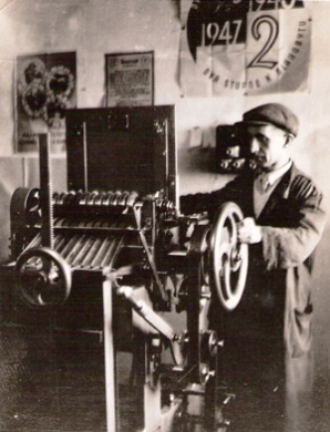 Tlačiarenský stroj a obsluhujúci pracovník v plášti. Na stene plagát Dvojročnice. Text. Tlačiareň cestovných lístkov Vrútky. Anon., cca 1950. 120 x 157