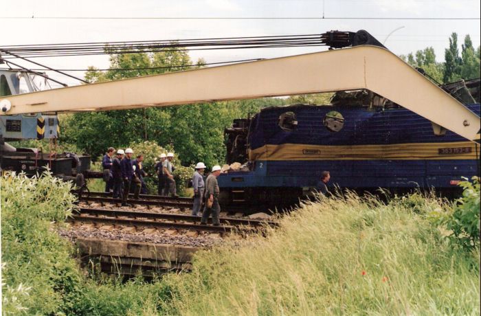 Nehoda v km 11,5 trati Jur - Rača 2.6.1995 medzi 6,46 - 6,52 hod (os 2827 a R 614). Rozbitý rušeň 363 153-8 a rameno žeriavu EDK 300. Ľudia v prilbách. Foto: M. Entner, 2.6.1995. 178 x 126, COLOR