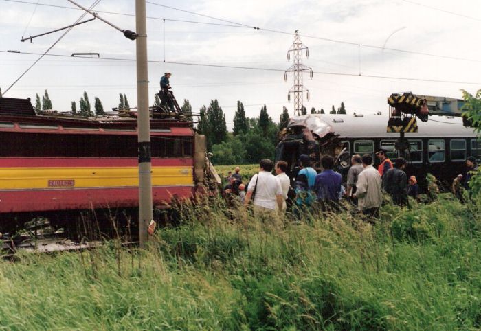 Nehoda v km 11,5 trati Jur - Rača 2.6.1995 medzi 6,46 - 6,52 hod (os 2827 a R 614). Vľavo rozbitá 240 143-8, vpr. poškod. vozeň 21-18 200. Rameno EDK 750. Robot., civili. Foto: M. Entner, 2.6.1995. 178 x 126, COLOR