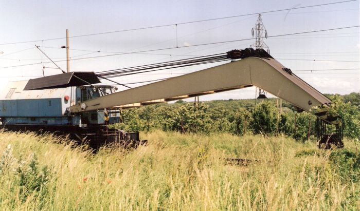 Nehoda v km 11,5 trati Jur - Rača 2.6.1995 medzi 6,46 - 6,52 hod (os 2827 a R 614). Žeriav EDK 300. Foto: M. Entner, 2.6.1995. 178 x 126, COLOR