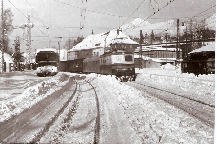 Štrba - zimný pohľad na výpr. budovu z koľajiska z poprad. strany. V stan. rýchlik s E 499.1042. Záveje. Text: Snehová kalamita v roku 1987. Foto: Z. Piešová, 1.1987. 130 x 90