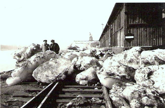 Bratisl. príst. - pohľ. v osi koľaje na nábr. Dunaja pri st. moste proti prúdu. Kusy ľadu na výh. s kruh. lampou. Dvaja civili. Vľ. Dunaj, vpr. drev. sklad, vzadu portál. žeriav. Text: Jar. ľadovce v marci 1947. Anon., 3.1947. 83 x 53