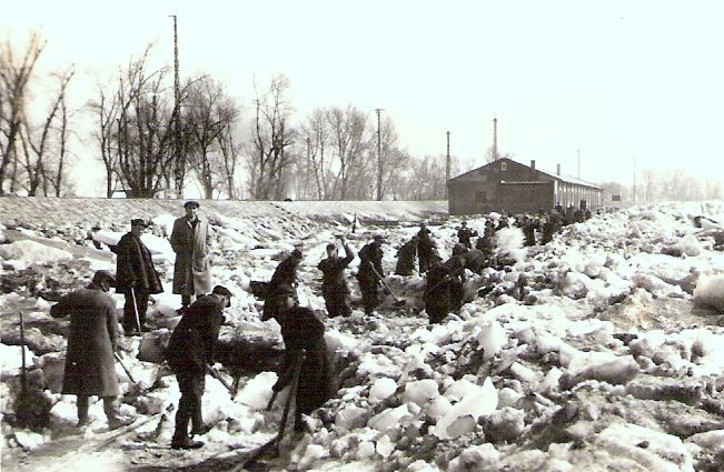 Bratislava - nábr. Dunaja pri zim. prístave. Pohľ. v osi nábr. koľaje zavalenej ľadom po prúde. Ľudia odpratávajúci ľad. Vľavo hrádza zimn. prístavu, vzadu sklad č. 11. Text: Jarné ľadovce v marci 1947. Anon., 3.1947. 83 x 53