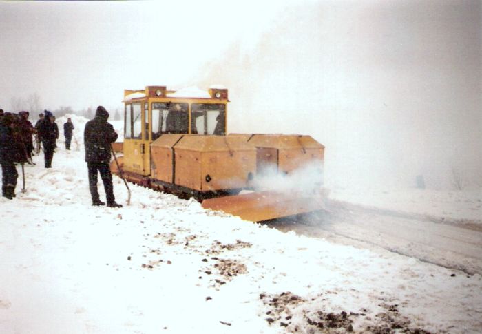 Snehová fréza na moderniz. MUV pri práci. Okolo vyčkávajú ľudia s náradím. Pohľad odzadu: Text: Snehová kalamita na konci zimy 1998/99. Foto: P. Bidlo, 1999. 126 x 88, COLOR
