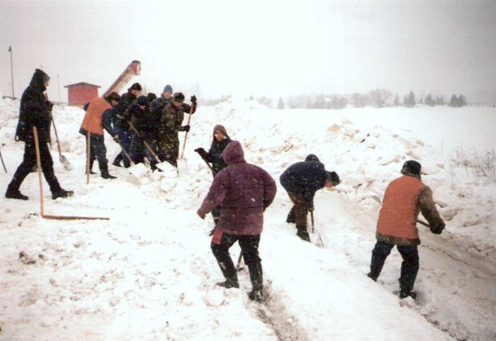 Skupina robotníkov TO Moldava n. B. pri ručnom čistení zaviatej koľaje v stanici. Vzadu stan. sklad, pás. dopravník a osvetľ. stožiare. Text: Snehová kalamita na konci zimy 1998/99. Foto: P. Bidlo, 1999. 126 x 88, COLOR