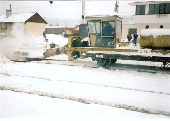 Trať. vozík s trysk. motorom vyfukuje sneh z výh. pri St. 3 na michaľ. zhlaví Košice os. st. Text: Sneh. kalamita na konci zimy 1998/99. Foto: F. Lorko (?), 1999. 126 x 88, COLOR