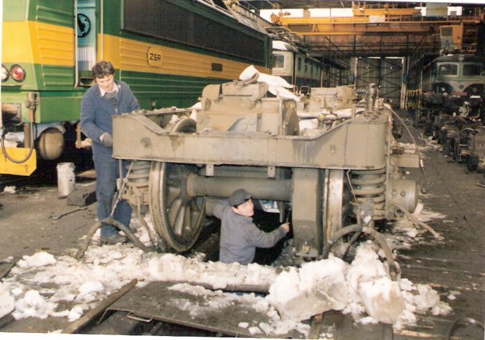 Košice - inter. haly opráv depa. Dvaja robotníci čistia od snehu vyviazaný podvozok 163. Vľavo vyviaz. 163, vzadu 182 a 140. Text: Snehová kalamita na konci zimy 1998/99. Foto: M. Onofrej (?), 1999. 126 x 88, COLOR