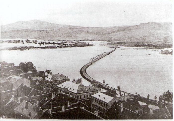 Trenčín - široký pohľad z hradu na jednokoľajný železničný most pri povodni r. 1894. In : Vasárnapi ujság 1894. 129 x 89, Retušované. Repro : J.Fojtík, ŠOBA Nitra