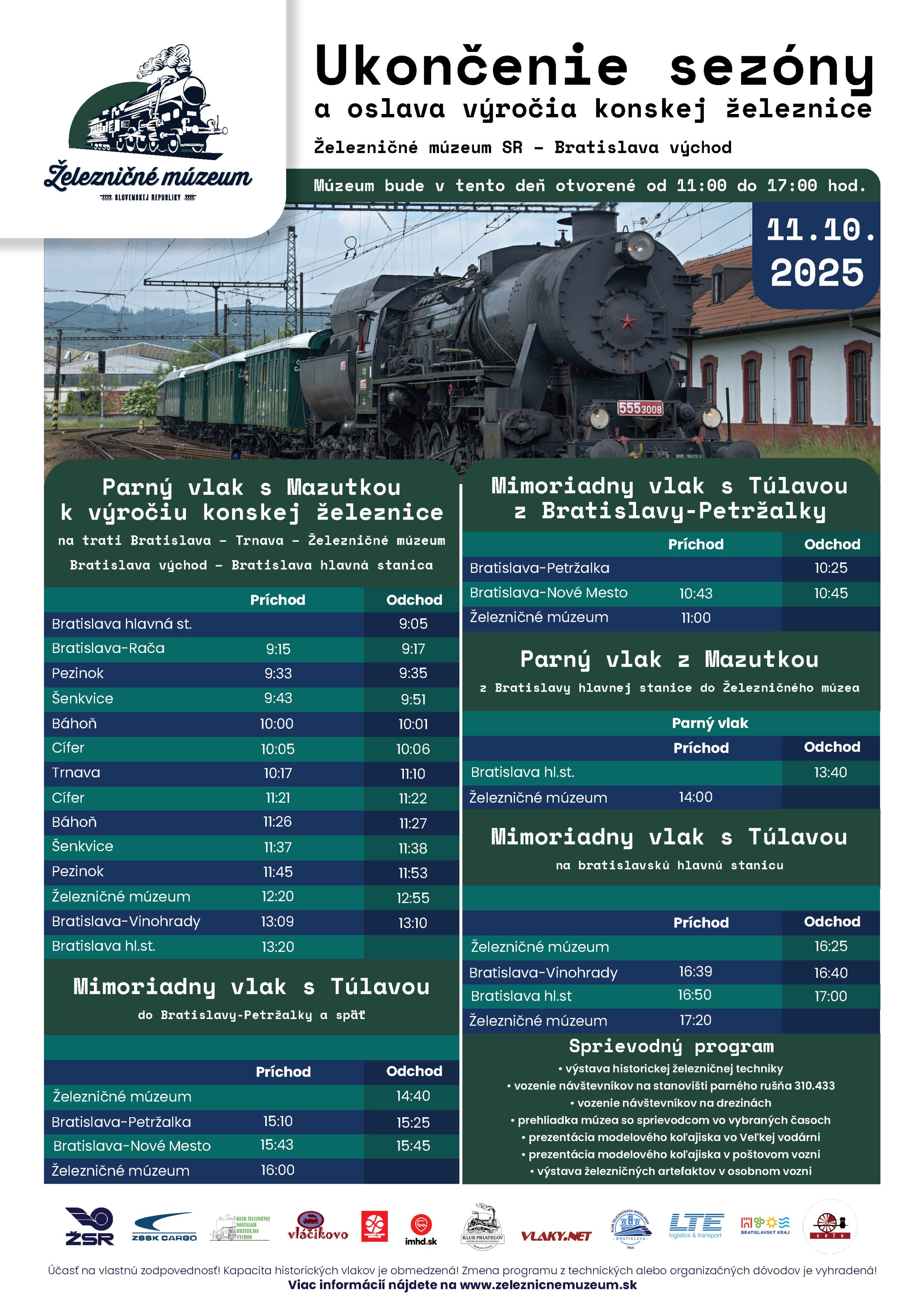 Veľkým lákadlom Ukončenia sezóny bude jazda historického parného vlaku s drevenými vozňami 3. triedy na trati Bratislava hlavná stanica - Trnava - Železničné múzeum Bratislava východ - Bratislava hlavná stanica, ktorý bude ťahať historický parný rušeň 555.3008 Mazutka. Vlak pôjde podľa nasledujúceho cestovného poriadku: